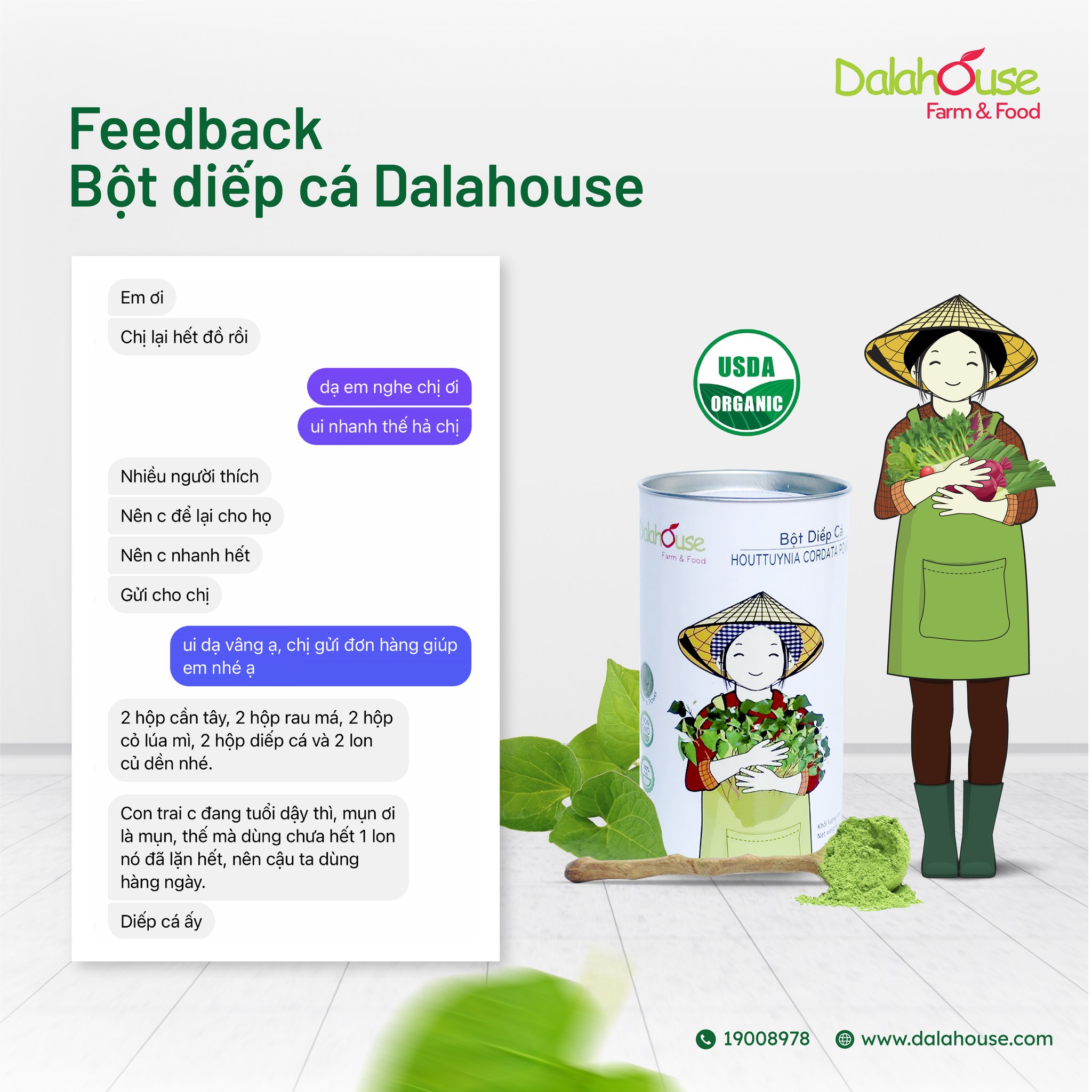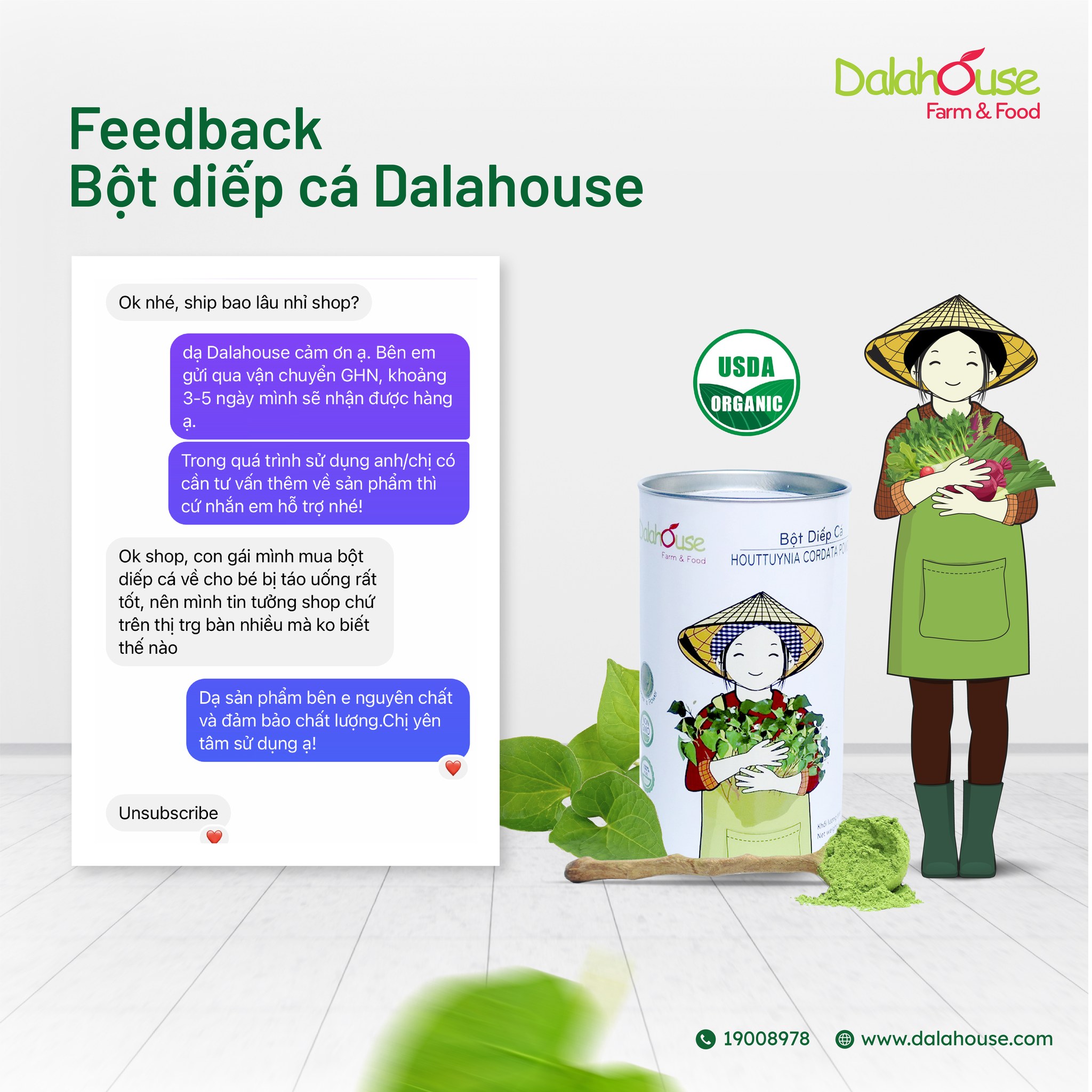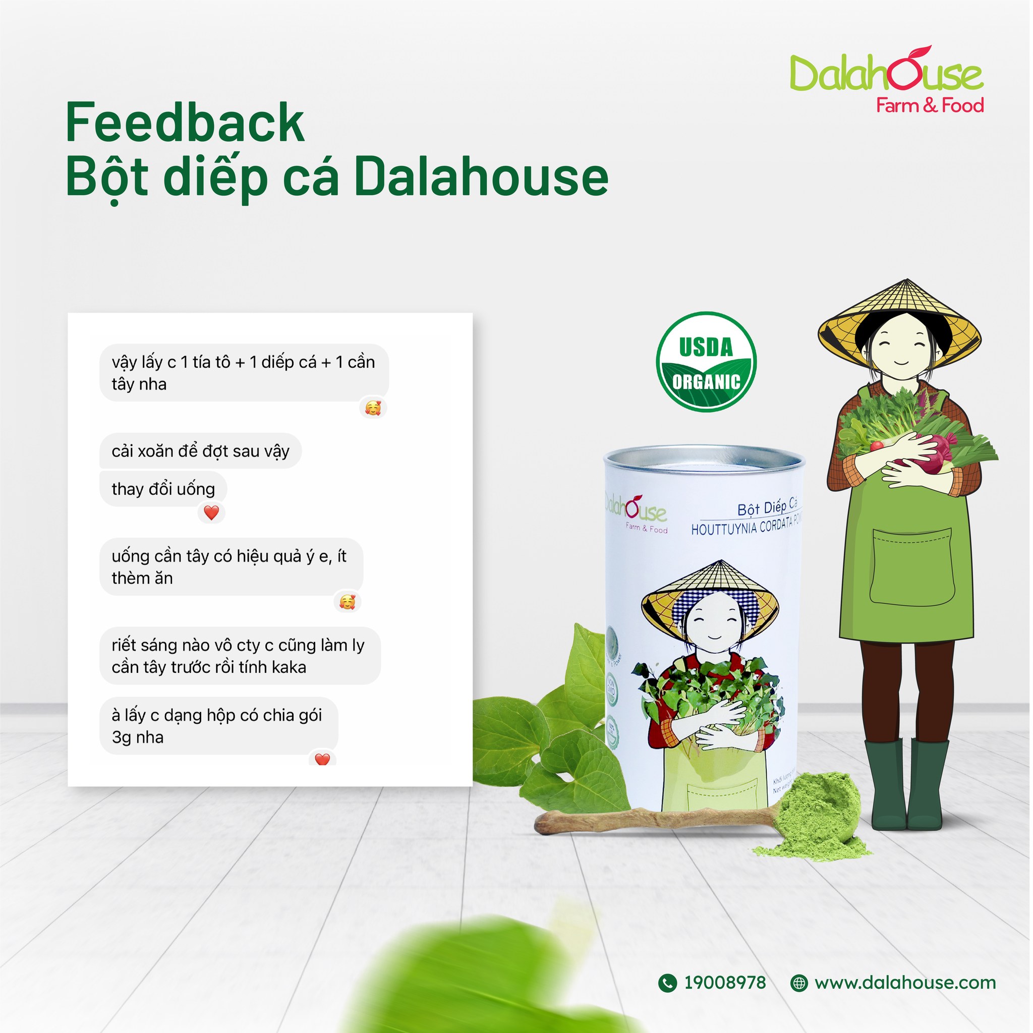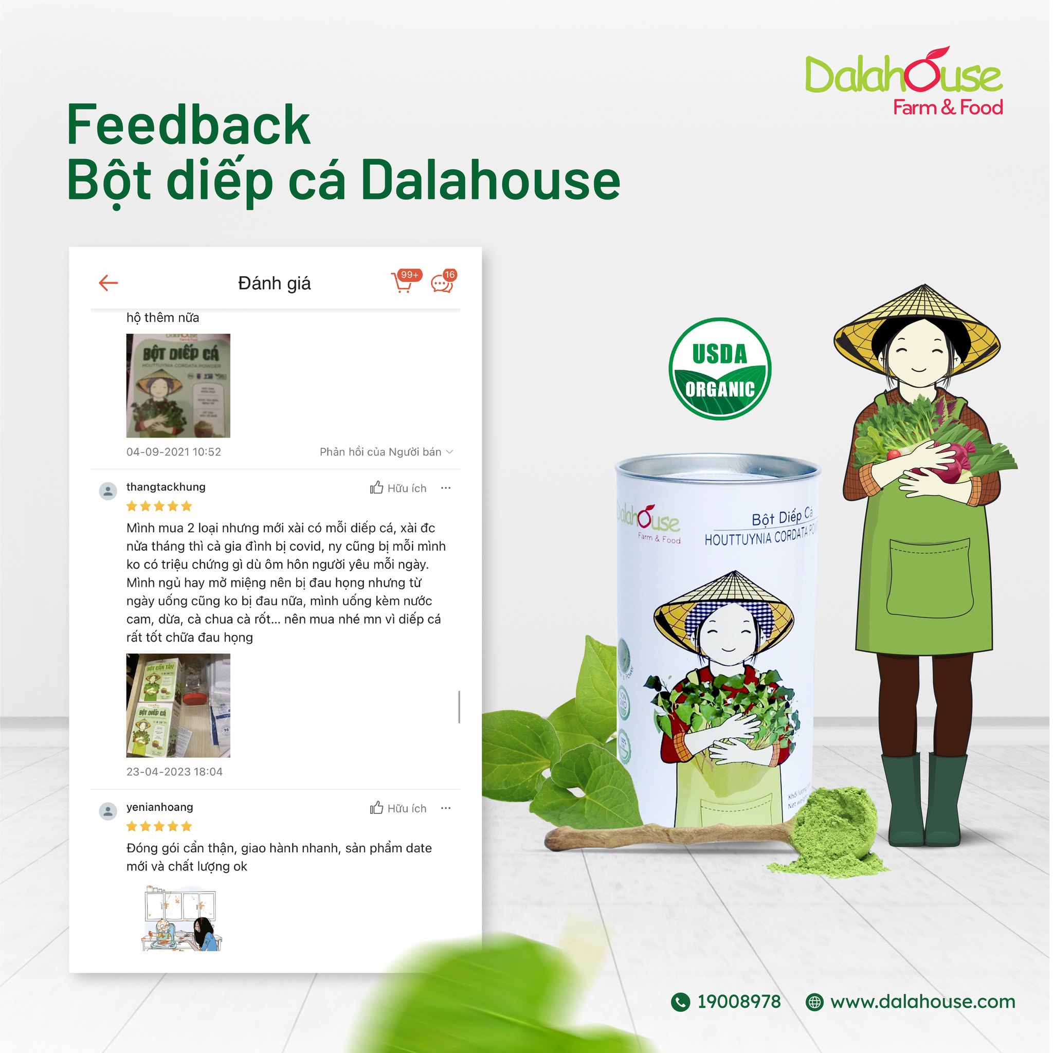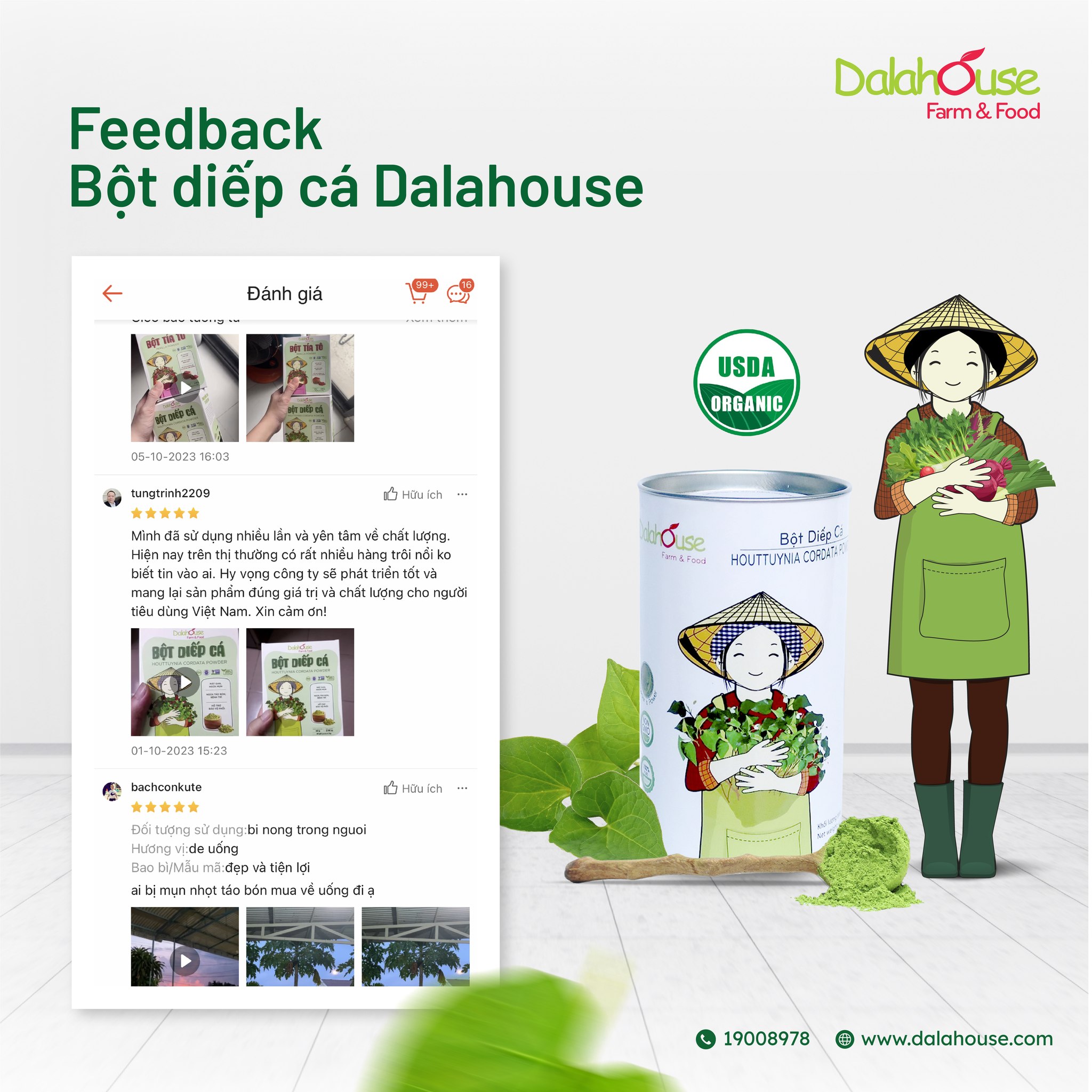 Niềm phấn khởi & sự cải thiện sức khoẻ tích cực của khách hàng là minh chứng rõ nhất khẳng định chất lượng sản phẩm và lợi ích thực sự của bột diếp cá hữu cơ Dalahouse.